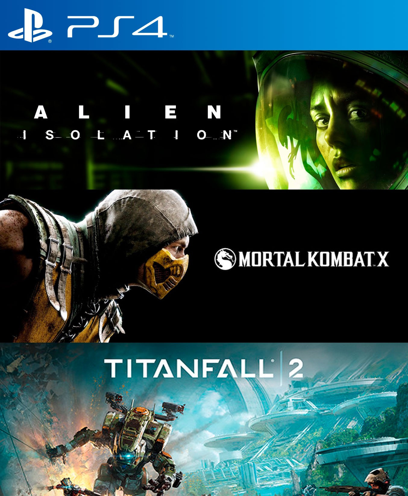 El pack incluye: - Alien Isolation PS4 - Mortal Kombat X PS4 - Titanfall 2 PS4 Pesos de los juegos : 83 GB Requerido en consola : 95 GB Instalación : 1 consola