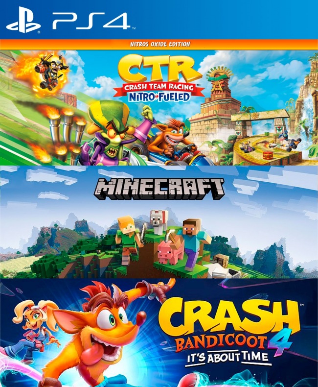 El pack incluye: - Crash Team Racing Nitro Fueled Edición Nitros Oxide PS4 - Minecraft PS4 - Crash Bandicoot 4 Its About Time PS4 Pesos de los juegos : 38 GB Requerido en consola : 50 GB Instalación : 1 consola