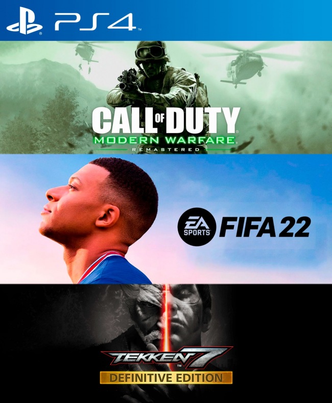 El pack incluye: - Call of Duty Modern Warfare Remastered PS4 - FIFA 22 PS4 - TEKKEN 7 Definitive Edition PS4 Pesos de los juegos : 158 GB Requerido en consola : 170 GB Instalación : 1 consola
